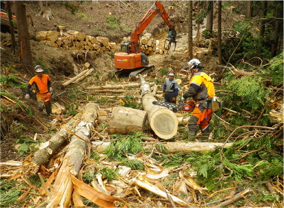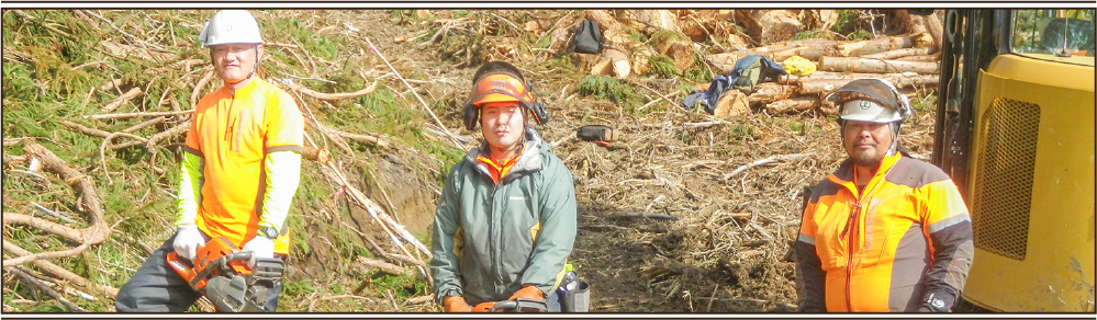 成木になり伐期を迎えた木材を建築用やチップ用として山から伐り出す作業です。高度な技術と高い安全性により、選定された木材を伐採し、用途に合った林業機械等を使用し搬出します。山のプロフェッショナルとしての経験や知識、高性能林業機械を駆使して、様々な需要に応える木材の生産供給に取り組みます。