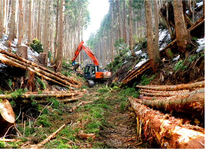 間伐や皆伐など森林の作業(管理)をする際、パワーショベルを用いて、道なき森林の中で作業をしやすくするための道を作ります。